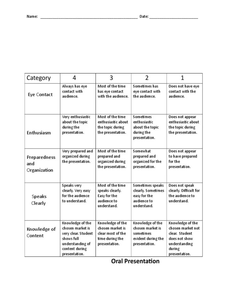 You must have a google drive account to access this resource. This rubric is designed to help you evaluate oral presentations. Web this editable rubric assesses the appropriate use of eye contact, clarity, volume, and body language during oral presentations.note: The rating scale is presented at the top of… For more help with grading, try our science investigation scoring rubric.