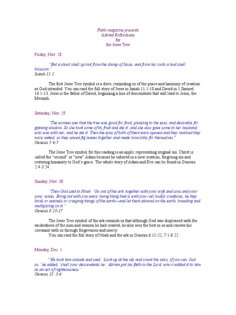 Jesse Tree Readings - He is often looked upon as the first person in the genealogy of jesus. There are enough jesse tree symbols here to cover each day from december 1 through december 25. The ornaments of the jesse tree tell the story of god in the old testament, connecting the advent season with the faithfulness of god across four thousand years of history. Web advent reading for the jesse tree. Each day of advent, read a bible story about someone on jesus’s family tree and hang an ornament symbolizing the story on your jesse tree. Each day of advent, read a bible story about someone on jesus’s family tree. Stories from the old testament are told, and participants create symbols to hang on jesus’ ‘family tree… It is a way to harness the celebration of jesus’s birth and to engage your children in a deeper understanding of jesus. If you’d rather leave the coloring to someone else, no problem! The jesse tree is a way to tell the story of jesus christ’s lineage through ornaments.