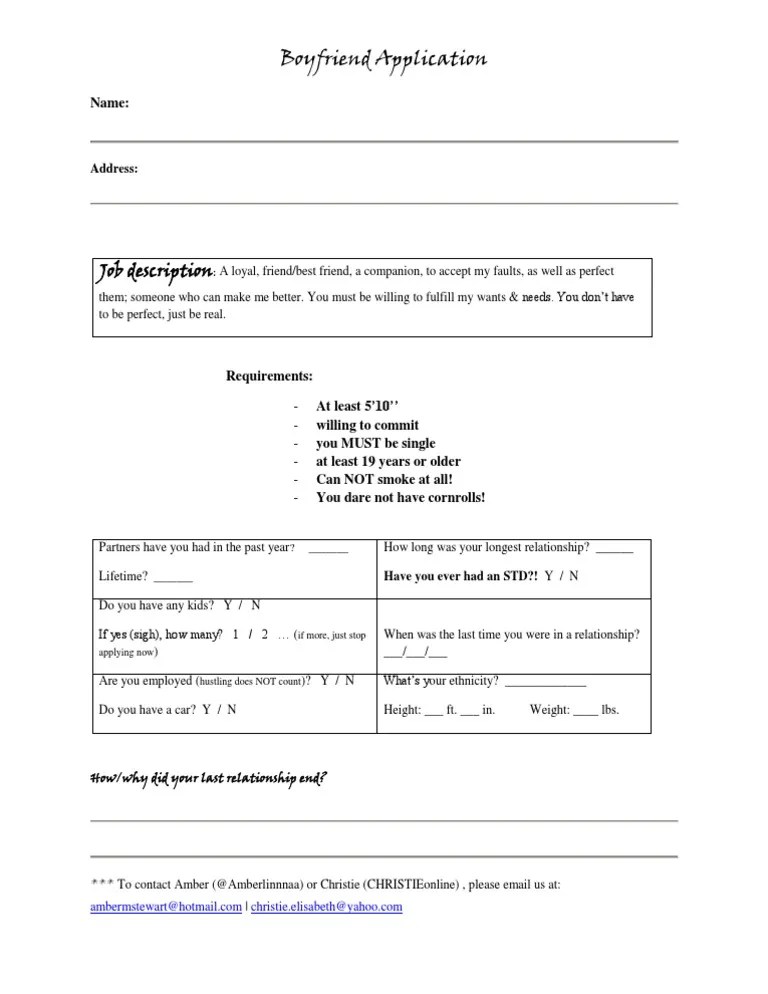 There is both a funny or serious version available. * where do you live? Web a boyfriend application form is a type of online form that you can use to find potential partners. Finish filling out the form with the done button.