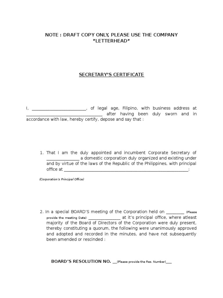 Open your ms word and apply. Secretary's certificate i, _____, a duly elected and qualified corporate secretary of _____, a corporation duly organized and existing under and by virtue of philippine laws (the “corporation”), do hereby certify that: The language is easily adaptable to fit your circumstances. This is a supporting document required for submission when assigning individuals. Web the.